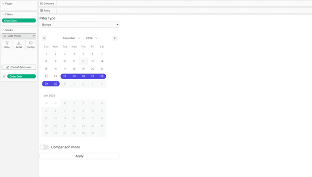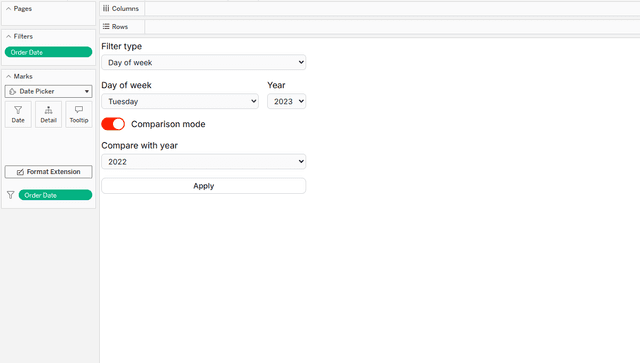 The Date Picker extension for Tableau is a powerful tool designed to enhance your data visualization experience. It allows users to easily filter data by date, making it simple to focus on specific timeframes or compare different periods. With its intuitive interface, users can select date ranges or predefined periods, such as "current month," to streamline their analysis. This extension is particularly useful for comparing data across time periods, enabling users to gain insights by juxtaposing current data with historical trends.
