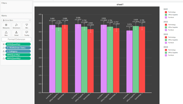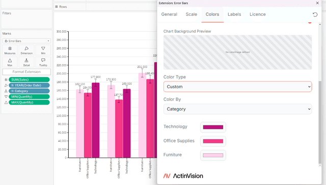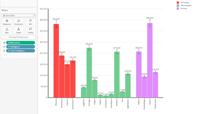 Labels and error bars are optimized to remain legible without overloading the chart, while Tableau tooltips continue to provide precise access to underlying values. The extension has been designed to remain effective with a moderate number of bars, and to guide the user in configuring parameters adapted to their analytical context.