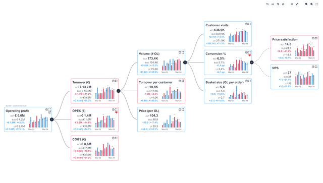 PowerKPIs を使用して戦略的なインサイトを Tableau のダッシュボードに統合 Tableau での分析のために、PowerKPIs を新しい主要なエントリ ポイントとして使用します。この拡張機能は、さまざまな KPI 間の接続を魅力的なバリュー ドライバー ツリー フォーマットで表示する強力なプラットフォームを提供します。そのため、データに基づく意思決定を可能にする有益なコンテキストが追加されます。PowerKPIs は、単一の直感的なインターフェイスを通じて、トップレベルのサマリーから運用上の特定の原動力の詳細な調査に至るまで、ビジネス パフォーマンスについて魅力的なストーリーを伝えらえるようにします。