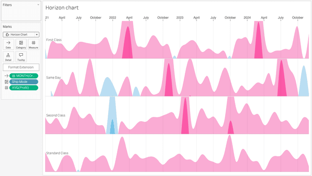 Horizon Chart is part of the Show Me More extension collection for Tableau.