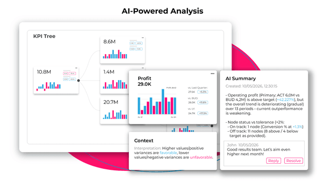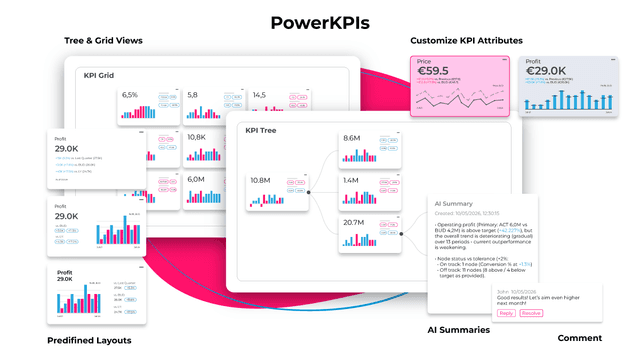 Integreer strategische inzichten in uw Tableau-dashboards met PowerKPIs Gebruik PowerKPIs als het nieuwe centrale ingangspunt voor uw analyses in Tableau. Het biedt een krachtig platform om de verbanden tussen verschillende KPI's te illustreren in een aantrekkelijke boomstructuur met waardedrivers, waardoor waardevolle context wordt toegevoegd aan datagestuurde besluiten. Van overzichten op het hoogste niveau tot gedetailleerde onderzoeken van specifieke operationele drijfveren, PowerKPIs verbetert uw vermogen om een overtuigend verhaal van bedrijfsprestaties te vertellen via één enkele, intuïtieve interface.