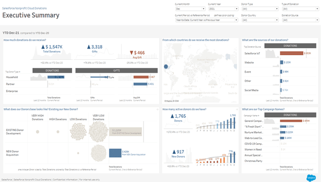 - Deep-dive at the lowest level of detail: Donor Type, Donor, Appeal
