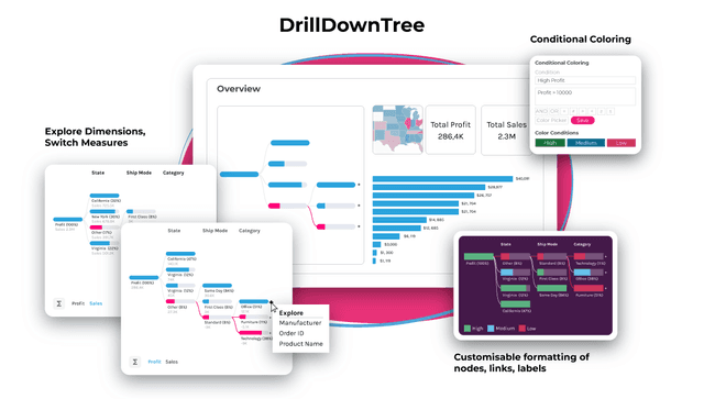 DrillDownTree permite que você faça uma busca detalhada em qualquer medida em qualquer dimensão que desejar. A extensão oferece um DrillDownTree flexível para usuários do painel. Ela permitirá que você visualize dados em várias dimensões sem configurar hierarquias antecipadamente. Visualize dados em várias dimensões.